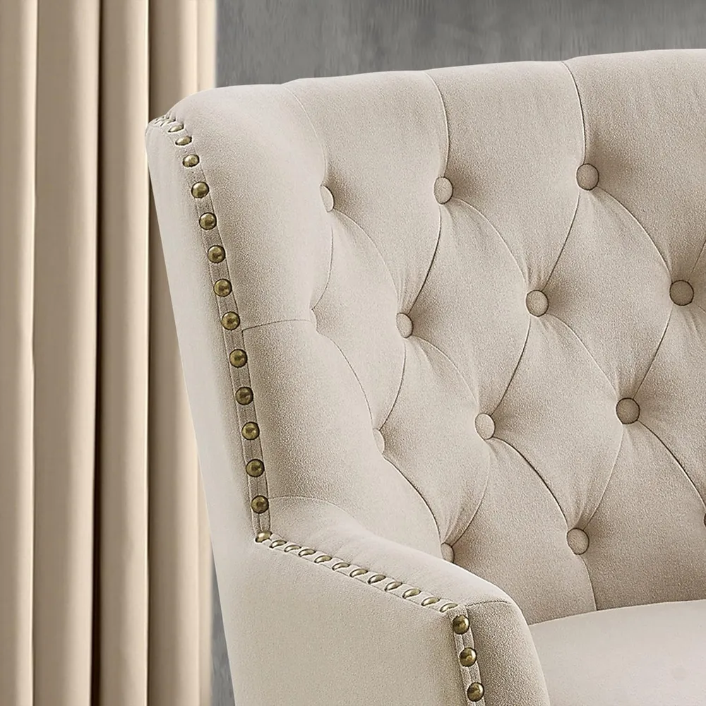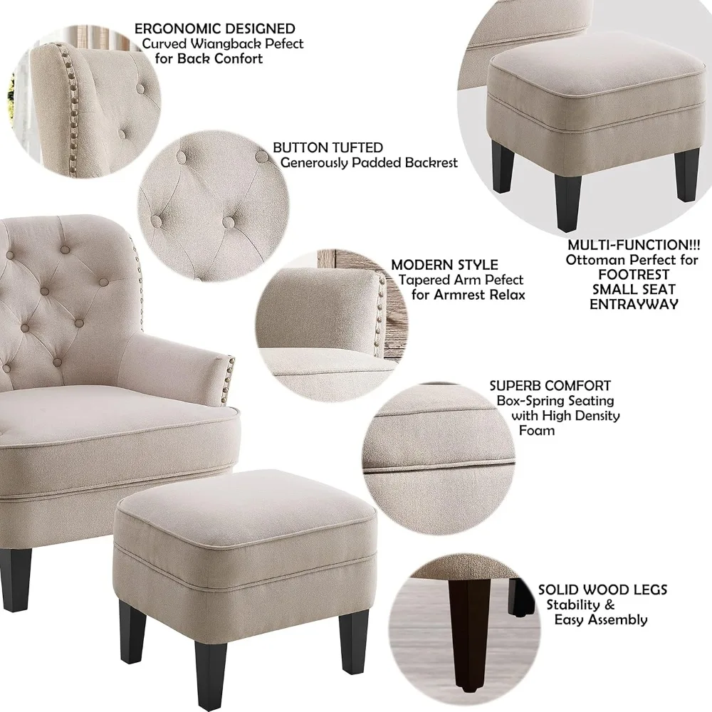 Discover the epitome of relaxation with our living room chair and ottoman set, designed with comfort in mind. The high-density foam cushions offer superior support, making it perfect for reading, watching TV, or simply relaxing. The ottoman provides an ideal resting spot for your feet, ensuring a comfortable unwinding after a long day. Our Sausalito Accent Armchair embodies timeless elegance, drawing inspiration from the classic Victorian furniture of the 20th century. The traditional button tufting and graceful curves are enhanced with contemporary touches such as nail head trim and thicker padding for added comfort, seamlessly blending the old with the new. Made to last, our tufted armchair and ottoman are crafted from premium materials and feature a reinforced frame for exceptional durability. This set is built to withstand daily use while maintaining its stylish appearance, making it suitable for both busy and quiet spaces in your home. Our modern accent furniture is elegant and adaptable, effortlessly complementing any decor style. The mid-century modern design and realistic color choices make it ideal for living rooms, bedrooms, or home offices. Whether you're looking to enhance your space or create a cozy reading nook, this set offers both style and comfort. Designed for your convenience, our accent chair and ottoman set is easy to assemble, allowing you to enjoy your new stylish chair and footstool quickly. Maintenance is simple; just wipe the chair with a clean cloth to keep it looking its best.
