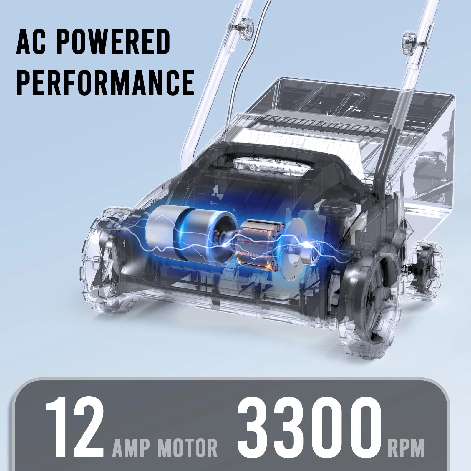 - Powerful 12-amp motor maintains steady cutting performance through thick grass and stubborn debris, so you achieve consistent dethatching and scarifying results.
